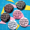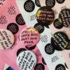 25mm or 59mm badges in a black/white/pink colour combos. It will come in a random colour, but leave a note on your order if you’d like a specific one.