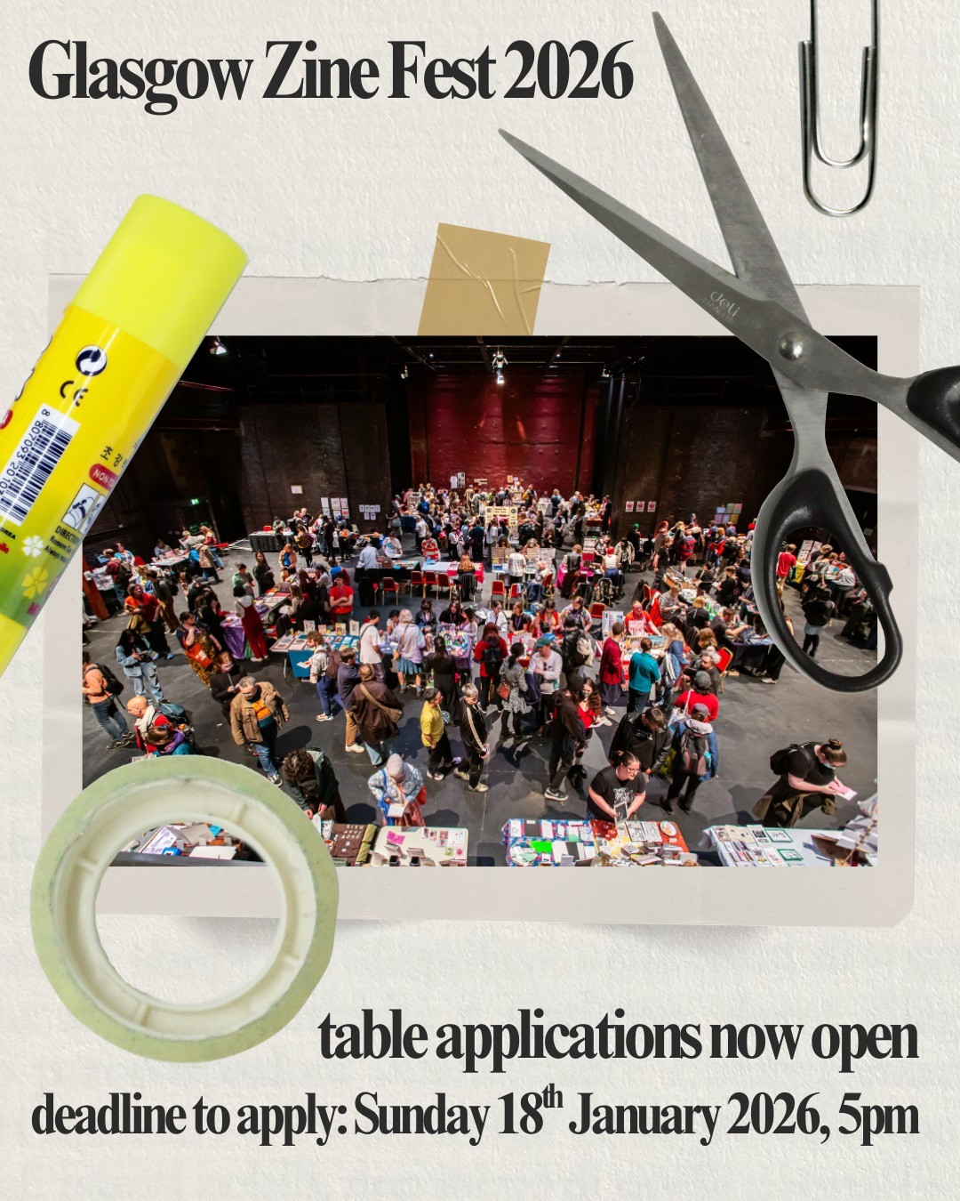 ✂️ GLASGOW ZINE FEST 2026 TABLE APPLICATIONS NOW OPEN! https://www.glasgowzinelibrary.com/glasgow-zine-fest Do you make zines? Do you want to show them off, sell them, and hang out with other zine-makers? Then apply for a table at Glasgow Zine Fest 2026! - 📕 About Glasgow Zine Fest: Glasgow Zine Fest is an annual celebration of zines, community […]